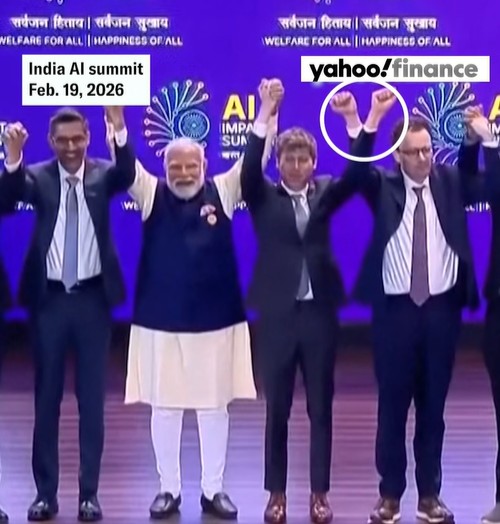 Sam Altman (CEO ของ OpenAI) และ Dario Amodei (CEO ของ Anthropic) หลีกเลี่ยงการจับมือกันระหว่างการถ่ายภาพหมู่ในงาน India AI Summit ณ กรุงนิวเดลี 19 Feb 2026